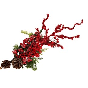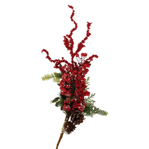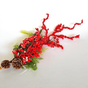 Galho Decorativo Natal Nevado 76cm com baga de Berry, frutas silvestres, ramos Verdes e pinha Natural, confeccionado em EPS (isopor), Plástico e haste de arame revestida.