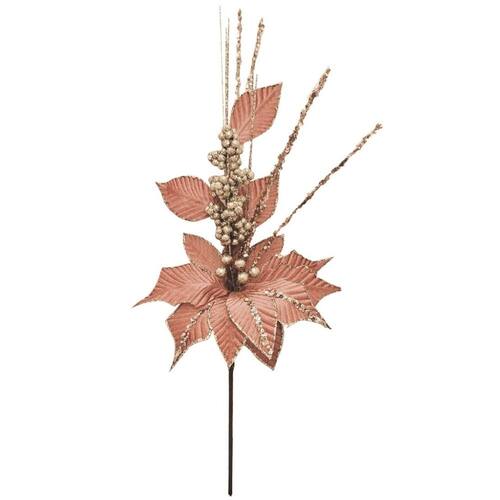 -01 Unidade Galho Natal Decorativo Flor Bico e Papagaio Veludo Texturizado Rosa Luxo Glitter 30cm