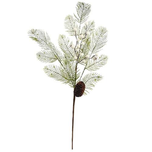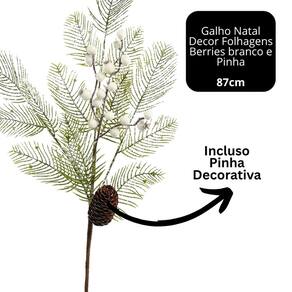 Galho Decorativo Natalino com Folhagens Nevadas, Berries Brancas e Pinha – 68cm