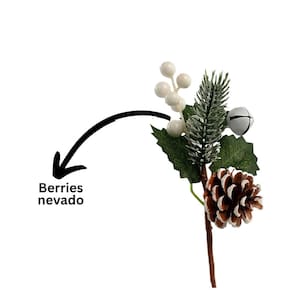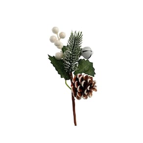 Conteúdo: 1 unidade – galho pick natalino com folhagens, pinha, guizo e berries nevado