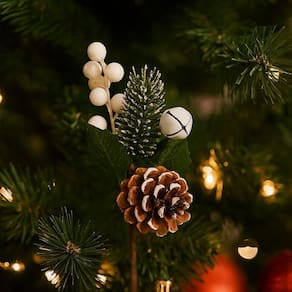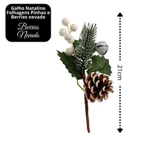 Galho Pick Natalino com Folhagens, Pinha, Guizo e Berries Nevado – 21cm