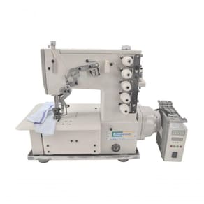 Máquina de costura industrial tipo galoneira com motor Direct drive. Aplicação para bainha, debrum (colarete) e rebatimento de elástico.