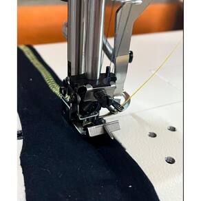 Máquina de costura industrial tipo galoneira com motor Direct drive. Aplicação para bainha, debrum (colarete) e rebatimento de elástico. 3 agulhas, 5 fios, Largura da costura = 6,35mm / 1/4?, Altura calcador = 6mm, Tipo agulha B63 x 11 # 14, Comprimento máximo do ponto = 4mm, Lubrificação automática, Rotação máxima = 3000 RPM, Motor Direct drive (motor acoplado internamente na máquina) AUTOVOLT.Funções