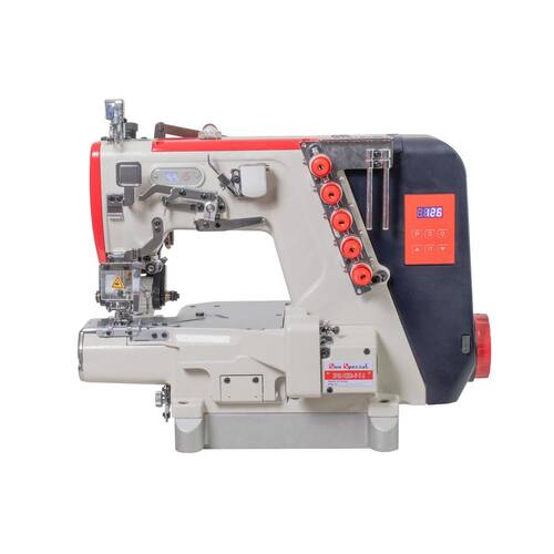 Galoneira Cilíndrica com catraca, Direct drive, CPU e painel acoplado ao cabeçote, com parada de agulha e controle de velocidade, 4500ppm. Pés com rodízios. Máquina enviada completa com mesa e pé.Funções