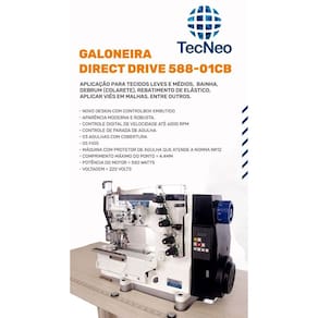 A TecNeo é a primeira empresa do Brasil especializada em equipamentos de IoT (Internet das Coisas).Galoneira Industrial Plana modelo 588 - 01 Direct Drive.Máquina de costura industrial Galoneira Industrial Plana Fechada, equipada com Motor Direct Drive e Control Box incorporados ao Cabeçote da própria máquina e com Móvel completo sendo a estante de ferro de altura regulável e Tampo revestido em fórmica. Aplicação: Bainha em camisetas, pregar e rebater elásticos, recobrir costuras, aplicar viés em malhas, etc.Detalhes técnicos:- 3 agulhas com Cobertura- 5 fios- Largura da costura = 6,35mm- Altura calcador = 6mm- Tipo agulha B63 - 10#-14#- Comprimento máximo do ponto = 4mm- Lubrificação automática- Rotação máxima = 6000 RPM- Motor Direct Drive Incorporado ao Cabeçote- Potência do motor = 550 watts- Voltagem do motor - 220 VoltsObservações Importantes:A Máquina será enviada em Dois volumes, compostos de 1 máquina Galoneira com Motor Direct Drive 220 volts + 01 móvel completo com estante de ferro com altura regulável e tampo revestido em fórmica.A responsabilidade da montagem do móvel e a instalação da máquina com a regulagem para os seus materiais, é de responsabilidade do comprador, o qual deverá contratar um Mecânico em máquinas de costura industriais para execução desses procedimentos e orientações técnicas à pessoa que irá operar aquela máquina.Qualquer dúvida ou mais informações estaremos a disposição para sua consulta.