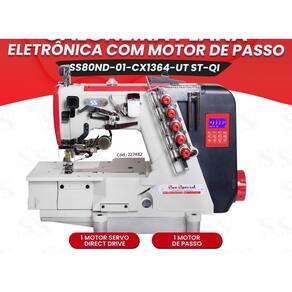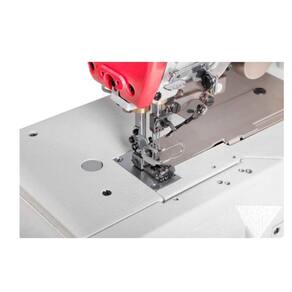 Máquina Galoneira Eletrônica de 4 Agulhas com Motor de Passo. Ideal para acabamentos industriais em moda íntima, fitness, praia e calçados. Possui corte de linha automático, levantamento do calcador automático, posicionador de agulha, sensores de fotocélula, corte de linha superior e inferior, porta USB, luminária de LED e sistema de lubrificação automático. Motor Direct Drive economiza energia e reduz vibrações.Alça retrátil