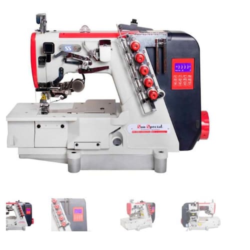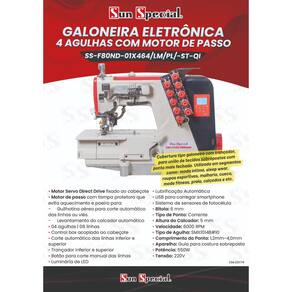 Máquina Galoneira Eletrônica de 4 Agulhas com Motor de Passo. Ideal para acabamentos industriais em moda íntima, fitness, praia e calçados. Possui corte de linha automático, levantamento do calcador automático, posicionador de agulha, sensores de fotocélula, corte de linha superior e inferior, porta USB, luminária de LED e sistema de lubrificação automático. Motor Direct Drive economiza energia e reduz vibrações.Alça retrátil