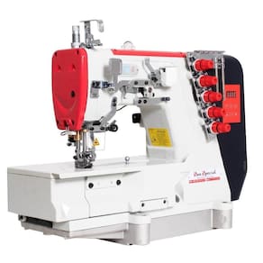 SS80D-01-CBX-364-STQI Galoneira, 110v+mesa plana, 3 agulhas, 5 fios, bitola 1/4 6.4mm, Direct drive, control box acoplado ao cabeçote, coração externo, 550w, 4500ppm, - Velocidade Máxima de 5.500 RPM com usb em Obd: porta fio de plástico reforçado - Pés com rodizios