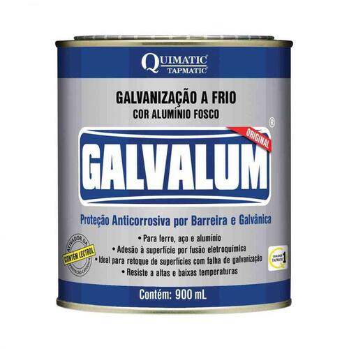 GALVALUM Galvanizador a frio 900ml Quimatic Tapmatic Descriçao do Produto Galvalum é um revestimento para galvanização à frio, possui uma combinação de zinco, metais galvânicos,alumínio e resinas selecionadascom excepcional propriedade anticorrosiva mais de 1000 horas de resistência em câmara de névoa salina Ideal para reparos em superfícies galvanizadas danificadas ou submetidas a processo de solda. Indicado para todas as superfícies que requerem proteção anticorrosiva excepcional. Cor de alumínio fosco, moderno e elegante. Ideal para estruturas metálicas, portões, cercas, janelas, silos, torres, pontes, suportes, telhados, tubos e peças metálicas, etc. Resiste à urina. Galvalum adere ao ferro, aço ou alumínio através de ação por fusão eletroquímica intensificada pelo Lectrol, que ativa a proteção catódica contra a ferrugem; Seu conteúdo metálico galvânico torna-se um ânodo e a superfície revestida um cátodo: assim, a atração das polaridades inversas assegura a deste produto na microporosidade de toda superfície metálica, impedindo o alastramento da ferrugem por baixo desta camada de proteção; Além da proteção galvânica, fornece também proteção anticorrosiva por barreira. Marca: Não Informado