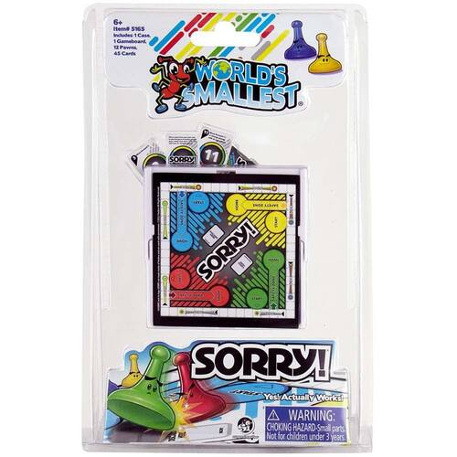 World's Smallest Sorry, 1-2 jogadores - O clássico jogo SORRY! agora está disponível em um tamanho que caberá na palma da sua mão! - The World's Smallest Sorry! o jogo funciona exatamente como a versão autêntico em tamanho real! Vem completo com 1 estojo, 1 tabuleiro, 12 peões, 45 cartas - Todas as peças cabem dentro da caixa de bolso, facilitando o armazenamento e a diversão para levar para qualquer lugar! A capa mede apenas 7,6 x 1,3 x 4,4 cm - Uma cesta de Páscoa perfeita, enchimento de meia, lembrancinha de festa e muito mais! - Para fãs de Sorry de todas as idades. Recomendado para crianças a partir de 6 anos