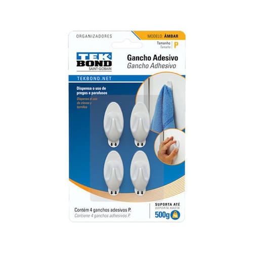 Gancho Adesivo Âmbar de Plástico Branco P Tekbond A linha de ganchos e organizadores adesivos da Tekbond oferece uma solução prática e resistente que permite decorar e organizar a sua casa ou o seu ambiente de trabalho. Marca: Tekbond Part number: 20801000202 Modo de Usar: 1. Limpe a superfície com álcool, removendo qualquer resquício de oleosidade ou poeira. Importante: O uso de detergentes ou outros produtos pode comprometer o desempenho da fita adesiva. 2. Remova o liner protetor da fita e aplique o produto no local desejado. 3. Faça pressão na peça por 30 segundos com certa força para potencializar a resistência da fita. 4. Aguarde 1 hora antes de utilizar o gancho. Importante: 1. Quanto maior a área de contato da fita, mais resistente é a aplicação. Por este motivo, não aplique os ganchos em superfícies irregulares, curvas ou com texturas. 2. As fitas não foram projetadas para suportar objetos tridimensionais de grande volume como, por exemplo, prateleiras. Não recomenda-se a aplicação de ganchos e fitas para objetos que fazem a pressão em forma de pêndulo. 3. Verifique a superfície onde será aplicada a fita / gancho. No momento da remoção, o adesivo da fita pode danificar superfícies com pintura ou reboco mal fixados e sem resistência. 4. Confira a carga de resistência para cada um dos produtos descritos nesta embalagem. Para Remover a Fita Permanente: 1. Passe um fio de Nylon ou similar - vagarosamente - entre a parede e o produto para soltar a fita adesiva. 2. Durante este processo, algum resíduo de fita pode ficar na parede. Utilize uma esponjinha com água e sabão para a limpeza da área. Para Remover a Fita Smart Removível: 1. Quando necessário, retire o gancho do suporte para ter acesso a lingueta da fita. Caso contrário, a lingueta já estará visível no produto. 2. Segure o suporte ou o gancho com uma das mãos e com a outra, puxe a lingueta para baixo, paralela à parede, até descolar totalmente a fita da parede. Nota: Uma vez removidas, as fitas não são reaproveitáveis. Especificações Produto: Modelo Âmbar P: Medida: 3x2,2cm Cor: branca Capacidade: 0,500 kg Unidades: 4