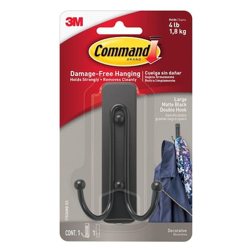 Command Gancho duplo preto fosco grande, 1 gancho e 1 tira Command , ganchos de parede para pendurar sem danos com tiras adesivas, sem ferramentas, ganchos para pendurar na decoração da casa, comporta