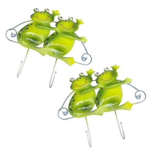 Características: - Material: Ferro - Cada unidade do produto tem 2 ganchos de metal, cada um com sapinhos decorativas, pintados - Cor predominante: verde - Tem na base superior desenho pintado de 2 sapinhos e abaixo 2 ganchos