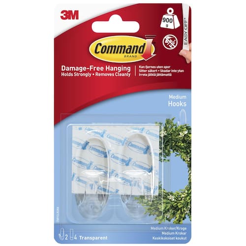 - Command Os ganchos médios transparentes se prendem fortemente em uma variedade de superfícies, como tinta, madeira, azulejo e muito mais