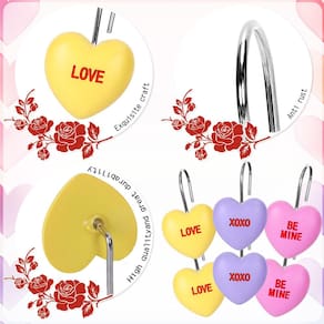 Características e benefícios: Os ganchos de cortina de chuveiro com 12 peças apresentam um tema de Dia dos Namorados em 3 estilos, atraentes e práticos, perfeitos para decoração de casa e festa. Eles são decoração perfeita para férias, dia dos namorados, casamento, aniversário e outras ocasiões, uma ferramenta prática para casa, sala de estar, quarto, banheiro, portas e ótimos para cortinas de chuveiro de banheiro, ganchos de cortina de janela, ganchos de toalha, etc. Especificações: Tamanho: mostrado na imagem Material: resina, metal A embalagem inclui: 12 ganchos de cortina de chuveiro de coração - O que você receberá – O conjunto inclui um total de 12 ganchos de cortina de chuveiro com tema de Dia dos Namorados em 3 estilos, o suficiente para atender ao seu uso diário e decoração de férias. - Design de coração de conversa de dia dos namorados - Estes ganchos de cortina de chuveiro têm o tema do Dia dos Namorados e vêm em formas de coração rosa, roxo e amarelo, design brilhante e colorido, tornando-o adequado para criar uma atmosfera acolhedora e alegre para sua casa e festa. - Fácil de instalar – Basta passar pelos ilhós da cortina de chuveiro e pendurar a haste do chuveiro de forma muito rápida e fácil. É fácil puxar toda a cortina para fechar e abrir. Estes ganchos de cortina de chuveiro funcionarão perfeitamente com sua cortina de chuveiro. - Bom material - Nossos ganchos de cortina de chuveiro são feitos de resina durável e material metálico, tornando-os fortes, duráveis e à prova de ferrugem. O tamanho do produto será mostrado na imagem. - Adequado para muitas ocasiões - decoração perfeita para férias, dia dos namorados, casamento, aniversário e outras ocasiões, uma ferramenta prática para casa, quarto, banheiro, portas e ótima para cortinas de chuveiro de banheiro, ganchos de cortina de janela, ganchos de toalha, etc.