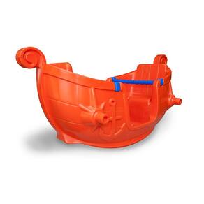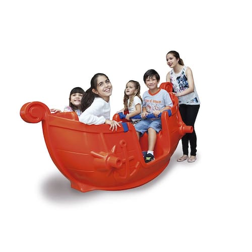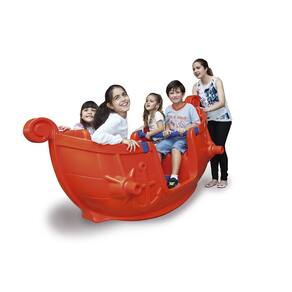Uma linda gangorra para 4 crianças em forma de barco viking para estimular a imaginação e criatividade das crianças contendo 2 bancos posicionados frente a frente com 2 assentos cada um, com uma trave de segurança em forma de corda naval para impedir que as crianças caiam dos assentos, canaletas centrais, nos contornos dos assentos e fendas no piso para impedir acúmulo de água, alto relevo nas laterais em forma de ancora, 2 saliencias externas em cada lateral na altura dos assentos para instalação no suporte previamente preparado para transformá-la em balanço. Fundo côncavo para permitir um balanço suave e com 2 saliencias nas extremidades inferiores que funcionam como bloqueio para evitar tombamento. Distancia de 1,30m entre encostos, abertura central de 0,44m para acesso aos assentos.