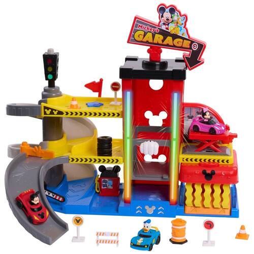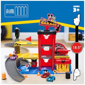 Garagem com 3 andares. 3 veículos de brinquedo: Mickey Mouse, Minnie Mouse e o bônus Donald Duck. 6 peças de pista. Bomba de gasolina, 2 cones de trânsito, uma barreira, um barril, um monte de pneus e 3 placas de sinalização. Características principais: