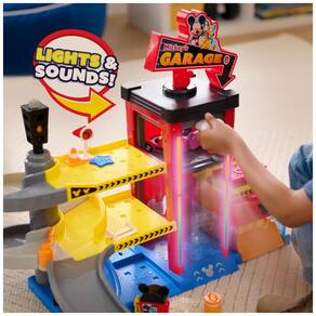 Transforme o momento de brincar em uma emocionante aventura com a Garagem do Mickey Mouse Pronto para a Corrida! Este conjunto completo oferece tudo o que as crianças precisam para ajustar, reparar e se divertir com muita velocidade.