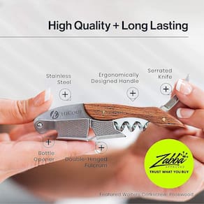 . UM GRANDE VALOR PARA O SEU DINHEIRO!!! Não deixe o preço enganá-lo, este é um sommelier fantástico inspirado, qualidade premium e durável 3 em 1 chave de garçons multifunções. Este saca-rolhas elegantemente mistura as características de um saca-rolhas de vinho, abridor de garrafas e cortador de papel alumínio todos juntos em um elegante e DURÁVEL corpo de AÇO INOXIDÁVEL 420 com alça de madeira de aperto de conforto. Inspira confiança e oferece o peso satisfatório e sólido de uma ferramenta fina e se sente bem na mão, como uma faca de cozinha bem equilibrada. Worm especialmente projetado feito de aço pesado é capaz de remover limpamente qualquer cortiça l ou sintética em apenas 5 curvas sem quebra. O entalhe de corte de precisão ao longo do parafuso segura firmemente a rolha e também reduz o arrasto à medida que corta a rolha, tornando-se menos provável que a rolha desmorone e oferecendo uma vantagem significativa sobre outros tipos de parafusos. DOUBLE HINGED FULCRUM fornece alavancagem extra e uma puxar mais suave até mesmo as rolhas mais longas. A dobradiça de duas etapas torna a abertura do vinho duas vezes mais fácil, permitindo uma boa tração e remoção de 2 passos da rolha e oferece uma vantagem mecânica significativa sobre os saca-rolhas de dobradiça única de estilo antigo. CORTADOR DE FOLHA LONGO, ARREDONDADO E SERRILHADO remove todos os tipos de folhas e elimina a necessidade de comprar outro gadget. Também é especialmente projetado para reduzir o risco de deslizamento e minimizar qualquer rasgo da folha ou plástico. NOTA - SE A FACA DE PAPEL ALUMÍNIO FOR DIFÍCIL DE ABRIR, BASTA APLICAR UM POUCO DE ÓLEO NAS DOBRADIÇAS DA FACA PARA SOLTÁ-LA. ISSO GERALMENTE VAI FAZER O TRUQUE! Um produto de alta qualidade apoiado pelo excelente atendimento ao cliente - Deixaremos nossas avaliações e feedback do vendedor falarem por si mesmos.