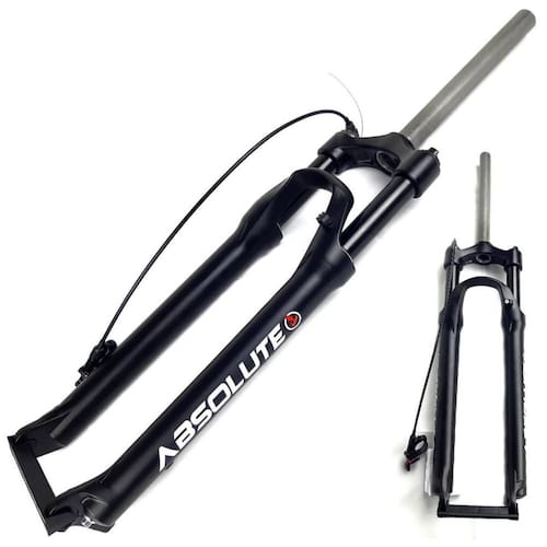 A suspensão Absolute é projetada para Mountain Bikes com aro 29, proporcionando um curso de 100mm para absorção de impactos em terrenos acidentados. Fabricada em aço carbono e alumínio, oferece resistência e durabilidade, mantendo o peso relativamente leve. A suspensão apresenta um sistema de amortecimento com molas especiais e elastômero, além de compatibilidade com freios a disco. A circunferência externa da espiga é de 28.6mm, enquanto a interna é de 25.4mm, com uma bengala de 30mm e espiga de 25 centímetros, garantindo robustez e estabilidade. Para maior conveniência, possui regulagem de pré-carga e trava no guidão, permitindo ajustes rápidos conforme o terreno. Com um peso aproximado de 2.630g, esta suspensão é uma excelente escolha para quem busca performance e confiabilidade em suas aventuras de mountain bike.