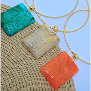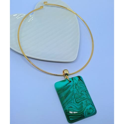 Gargantilha Choker Aro Liso Rigido Folheado a Ouro Dourado Antialérgico com Pingente Retângulo Resinado Tendência Luxo - Cor: Verde