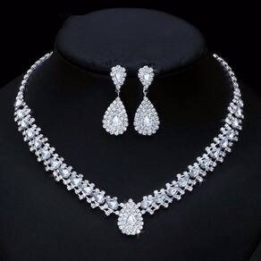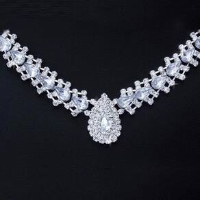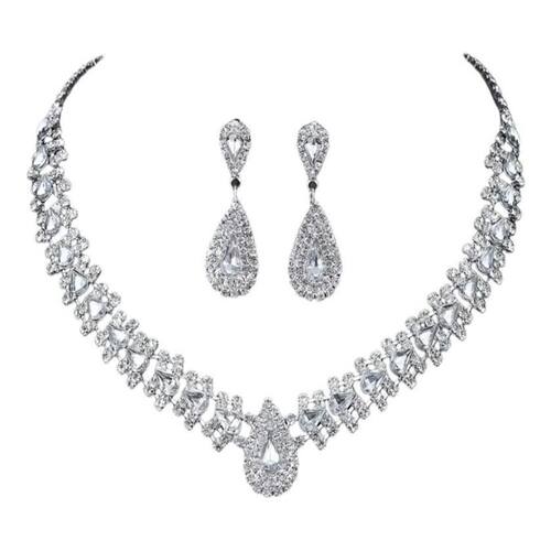 Conjunto colar e brinco em formato de gota banhado a ouro branco com cristais austríacos
