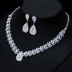 Conjunto colar e brinco em formato de gota banhado a ouro branco com cristais austríacos