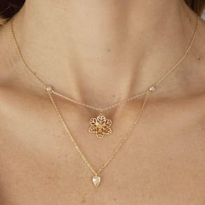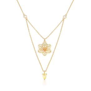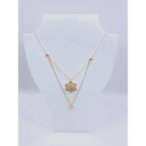 Colar duas voltas em malha portuguesa de flor lisa e vazada com cristal na cor prasiolita e pontos de luz banhada a ouro.