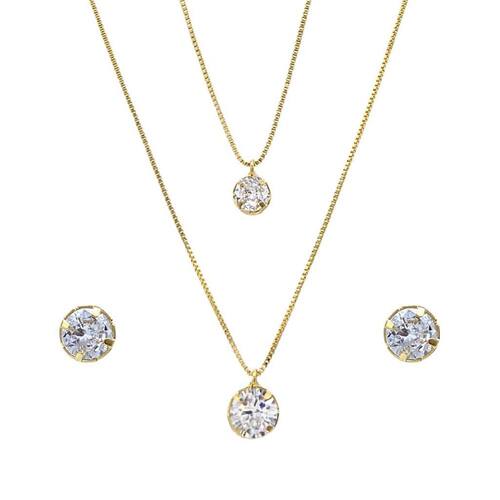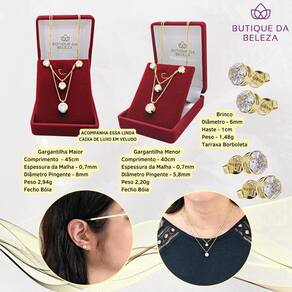 Gargantilha Dupla Folheada A Ouro 45Cm E 40Cm + Brinco Solitário Redondo De Zircônia Especificações do produto Gargantilha maior - 45cm Espessura da malha - 0,7mm Diâmetro pingente - 8mm Peso 2,94g Fecho bóia Gargantilha menor - 40cm Espessura da malha - 0,7mm Diâmetro pingente - 5,8mm Peso 2,20g Fecho bóia Brinco Diâmetro - 6mm Haste 1 cm Peso 1,48g Tarraxa borboleta Descrição do produto Conjunto folheado a ouro gargantilha dupla 45cm e 40cm + brinco solitário zircônia redonda As semijoias possuem como grande vantagem o mix de combinações de acessórios. Se você deseja variação de looks nós temos o kit perfeito. Esse mix é composto por duas gargantilhas de malha veneziana com comprimentos diferentes , formando uma só peça, arrojada e que chamará a atenção de todos. Tanto as correntes como o brinco possuem zircônias cravejas que darão ainda mais elegância e brilho ao seu visual. Não perca essa oportunidade e tenha em mãos esse lindo conjunto de semijoias folheadas a ouro. Nós da butique da beleza temos as peças mais exclusivas para os clientes mais exigentes. O que oferecemos Um banho de ouro 18k, com qualidade , cor e tonalidade idênticas ao de uma peça de ouro 18k. Vendemos a experiência de você poder usar um produto arrojado, se sentir bela o e elevar sua autoestima. Embalagem Caixa veludo de luxo foto do anúncio para você guardar sua semijoia e mantê-la brilhante por muito tempo. É bijuteria ou semijoia Todas nossas peças são semijoias, ou seja a deposição de ouro sobre o metal pode ser até 250 vezes maior que a quantidade de ouro 18k depositada em uma peça de bijuteria. Portanto o que nós oferecemos é qualidade. É banhado ou folheado a ouro Os dois termos significam a mesma coisa, referem-se ao processo de galvanoplastia onde o metal, nesse caso o ouro , é adicionado a peça, conferindo proteção, brilho e cor, sendo estas características gerais de uma semijoia de qualidade. As semijoias dão alergia Não Nossos produtos são níquel free, cádmio free e Cinza free, todos esses compostos químicos são alérgicos e estão fora de nosso processo de produção. Tem Sim Oferecemos 6 meses mediante apresentação do certificado de . Marca: Não Informado