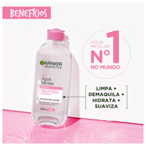 A Água Micelar Garnier SkinActive Tudo em 1 traz uma fórmula não oleosa, com textura leve e delicada, para retirar todas as impurezas, como sujeira e maquiagem. As pequenas micelas limpadoras mantém a hidratação natural da pele, enquanto realizam poderosa ação adstringente e tonificante, na superfície. Em um só gesto o produto limpa, demaquila, hidrata e suaviza.