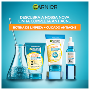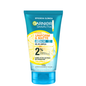Gel de limpeza facial para pele acneica. Garnier SkinActive Uniform & Matte Antiacne realiza uma higienização de alta performance que remove até 99% das bactérias responsáveis por causar as espinhas.