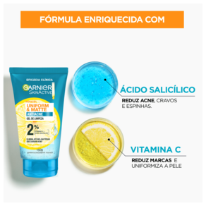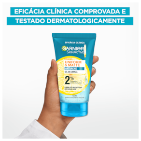 O Gel de Limpeza Facial Garnier SkinActive Uniform & Matte Antiacne conta com uma fórmula vegana, livre de Parabenos e cruelty free com eficácia clínica comprovada. Sua ação reduz cravos, espinhas e oleosidade, além de uniformizar o tom e proporcionar um aspecto sequinho através de seu efeito matte.