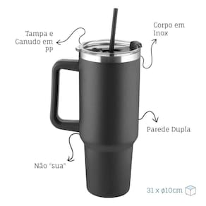 Produzida em inox reciclado com parede dupla (interno 304 e externo 201), garante resistência e manutenção da temperatura por mais tempo. Seu acabamento em pintura a pó proporciona elegância, enquanto a tampa e o canudo em plástico PP, na mesma cor do produto, completam a praticidade