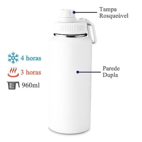 - Capacidade generosa: Os 960ml são ideais para acompanhar você ao longo do dia, seja no trabalho, na academia ou em viagens.