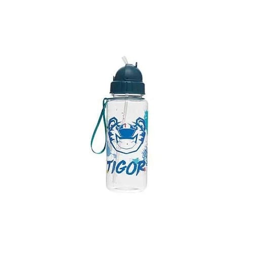 Garrafa com canudo Tigor, confeccionada em plástico estampado, canudo de silicone, tampa de rosquear e etampa exclusiva.