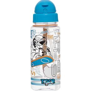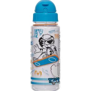 Garrafa com canudo Tigor, confeccionada em plástico estampado, canudo de silicone, tampa de rosquear e etampa exclusiva.