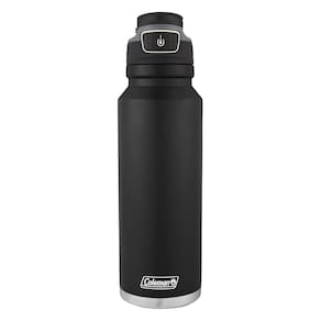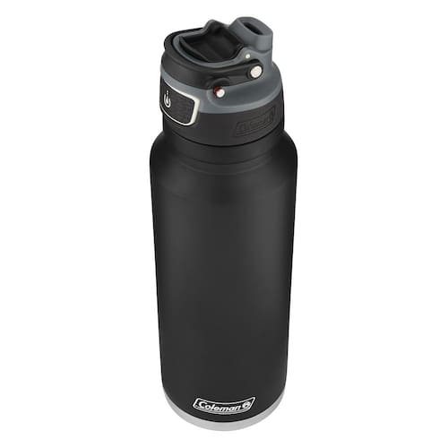 Coleman Garrafa de água de aço inoxidável Coleman FreeFlow AUTOSEAL, preta - Garrafa de aço inoxidável 18/8 durável, de parede dupla, isolada a vácuo, mantém as bebidas frias por até 58 horas ou quentes por até 20 horas - O bico de alto fluxo permite que você hidrate rapidamente - O recurso de vedação automática operado por botão veda a tampa entre goles para remover derramamentos e vazamentos, e uma trava deslizante patenteada evita o apertar acidental do botão enquanto você está em movimento - A capa protetora do bico mantém a sujeira e os insetos longe do bocal, e o recurso de tampa suspensa facilita a limpeza - 100% livre de BPA para tranquilidade - Este produto contém aço inoxidável (ferro, cromo, níquel, manganês), estireno, formaldeído, octametilciclotetrasiloxano