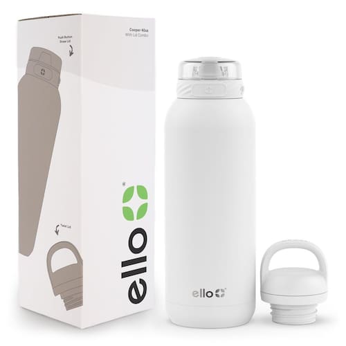 Ello Garrafa de água Cooper de aço inoxidável de 1,134 g com 2 tampas Chug e canudo | À prova de vazamento | Parede dupla e isolada a vácuo | Alça de transporte embutida | Segura para lava-louças | - 2 tampas: escolha entre duas opções de tampa à prova de vazamento: um bico de silicone macio para beber facilmente ou uma tampa giratória para hidratação rápida. - Mantém frio o dia todo: parede dupla e isolamento a vácuo para manter as bebidas frias por até 24 horas. Mantenha-se hidratado não importa onde a vida o leve com nossa garrafa de água confiável. - 100% à prova de vazamento: nossa garrafa possui uma vedação de parafuso segura e à prova de vazamentos, permitindo que você a jogue em sua bolsa sem preocupações. - Fácil de viajar: leve sua garrafa de água onde a vida levar você, graças à alça de transporte embutida. Prenda-o à sua mochila, bolsa de ginástica ou carregue-o à mão. - Fácil de limpar: a tampa pode ser lavada na prateleira superior da lava-louças, o que facilita a limpeza. Recomendamos lavar o corpo à mão para maior longevidade, sinta-se à vontade para jogá-lo na máquina de lavar louça, se preferir. Todas as peças são livres de BPA.