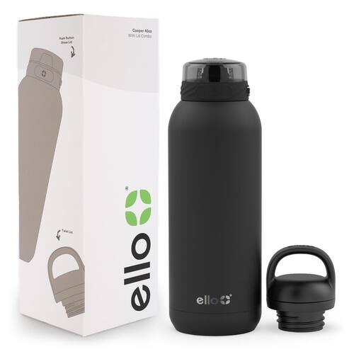 Ello Garrafa de água Cooper de aço inoxidável de 1,18 l com 2 tampas Chug e canudo | À prova de vazamento | Parede dupla e isolada a vácuo | Alça de transporte embutida | Segura para lava-louças | - 2 tampas: escolha entre duas opções de tampa à prova de vazamento: um bico de silicone macio para beber facilmente ou uma tampa giratória para hidratação rápida. - Mantém frio o dia todo: parede dupla e isolamento a vácuo para manter as bebidas frias por até 24 horas. Mantenha-se hidratado não importa onde a vida o leve com nossa garrafa de água confiável. - 100% à prova de vazamento: nossa garrafa possui uma vedação de parafuso segura e à prova de vazamentos, permitindo que você a jogue em sua bolsa sem preocupações. - Fácil de viajar: leve sua garrafa de água onde a vida levar você, graças à alça de transporte embutida. Prenda-o à sua mochila, bolsa de ginástica ou carregue-o à mão. - Fácil de limpar: a tampa pode ser lavada na prateleira superior da lava-louças, o que facilita a limpeza. Recomendamos lavar o corpo à mão para maior longevidade, sinta-se à vontade para jogá-lo na máquina de lavar louça, se preferir. Todas as peças são livres de BPA.