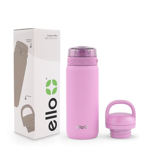 Ello Cooper Garrafa de água infantil de aço inoxidável de 510 g com 2 tampas e canudo | Isolamento a vácuo de parede dupla à prova de vazamento | Serve para porta-copos de carro | Alça de transporte - Bico de mandril: o bico estilo chug fácil de usar proporciona um fluxo suave e contínuo de hidratação, enquanto a alça incorpora uma alça de transporte fácil de usar - Mantém frio o dia todo: parede dupla e isolamento a vácuo para manter as bebidas frias por até 24 horas. Mantenha-se hidratado não importa onde a vida o leve com nossa garrafa de água confiável. - 100% à prova de vazamento: nossa garrafa possui uma vedação de parafuso segura e à prova de vazamentos, permitindo que você a jogue em sua bolsa sem preocupações. - Fácil de viajar: leve sua garrafa de água onde a vida levar você, graças à alça de transporte embutida. Prenda-o à sua mochila, bolsa de ginástica ou carregue-o à mão. - Fácil de limpar: a tampa pode ser lavada na prateleira superior da lava-louças, o que facilita a limpeza. Recomendamos lavar o corpo à mão para maior longevidade, sinta-se à vontade para jogá-lo na máquina de lavar louça, se preferir. Todas as peças são livres de BPA.