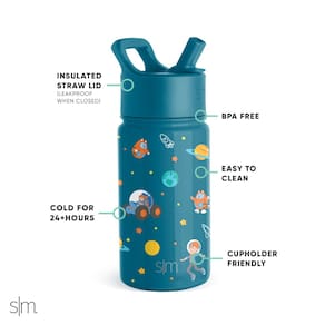Simple Modern Garrafa de água infantil Blippi com tampa de canudo | Copo reutilizável de aço inoxidável isolado para crianças, escola | Coleção Summit | 400 ml, Blippi Space - Isolamento de parede dupla: mantém as bebidas em temperaturas ideais por horas - À prova de vazamento quando o bocal está na posição fechada; não recomendado para bebidas quentes ou gaseificadas. - Livre de BPA e lavável na lava-louças na prateleira superior - Compatível com porta-copos: garrafas de 290 a 510 ml servem na maioria dos porta-copos - Garantia vitalícia limitada e patente pendente