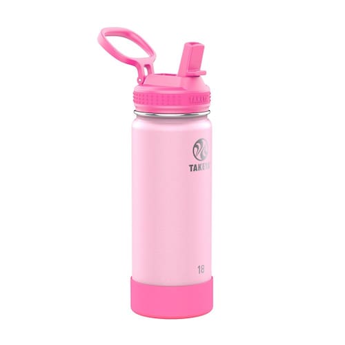 Takeya Garrafa de água que brilha no escuro Actives Kids com tampa de canudo - Garrafa de aço inoxidável com tampa sem BPA - Garrafa de água reutilizável e segura para lava-louças - 510 g, rosa brilho - Garrafa de água exclusiva para crianças: possui um amortecedor e tampa que brilha no escuro, tornando-a uma garrafa de água perfeita para a escola e uso diário por crianças - Garrafa com isolamento duplo: esta garrafa de água mantém as bebidas frias por 24 horas, garantindo uma garrafa de água reutilizável de alto desempenho - Tampa conveniente com alça de laço: garrafa de água fácil de transportar com uma alça de tampa embutida, ideal para atividades ao ar livre crianças ativas - Garrafa e tampa seguras para lava-louças: este design de garrafa de água e tampa simplifica a limpeza graças aos materiais seguros para lava-louças, perfeito para famílias ocupadas