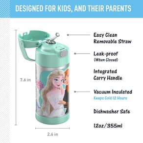 A THERMOS FUNTAINER Garrafa de Água com Canudo de 340 ml é uma opção ideal para manter as bebidas das crianças frescas por até 12 horas, graças à tecnologia de isolamento a vácuo THERMOS. Este modelo, inspirado no universo de Frozen 2, é leve e compacto, sendo fácil de transportar, com uma tampa de botão que facilita a abertura. A garrafa é feita de aço inoxidável 18/8 de alta qualidade, garantindo resistência a quedas e amassados para uso diário. Além disso, possui uma alça de transporte com toque suave e o canudo pop-up removível, que facilita a limpeza. A garrafa pode ser lavada na lava-louças, embora a lavagem manual seja recomendada para uma melhor conservação. Com mais de 120 anos de tradição, a Thermos é conhecida por produzir recipientes confiáveis que mantêm alimentos e bebidas frescos e protegidos.
