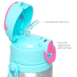 Possui canudo em silicone, tampa com trava de seguranca e cordinha antiqueda.