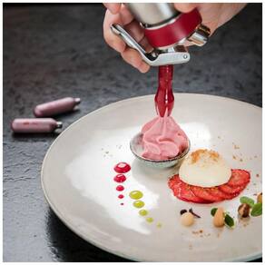 O produto pode ser para aplicações quentes e frias. Crie chantilly fresco que você controla os ingredientes de, ou espumas especializadas e espumas aromatizadas. O produto tem uma garrafa de Aço Inoxidável e cabeça ambos são laváveis na máquina de lavar louça e resistentes o suficiente para suportar cozinhas profissionais Inclui Ponta Reta de Aço Inoxidável, estrela, reta e tulipa, uma escova de limpeza e suporte para carregador. O produto é NFS e HACCP qualificado O Chicote Gourmet está disponível em 3 tamanhos diferentes. iSi tem uma variedade de acessórios disponíveis para maximizar suas criações culinárias também. iSi carregadores estão disponíveis para compra aqui e são necessários para carregar o seu chicote