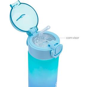 Sua tampa, com botão de abertura e trava de segurança, possui um visor e conta com um canudo de silicone.