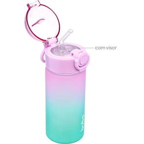 Sua tampa, com botão de abertura e trava de segurança, possui um visor e conta com um canudo de silicone.