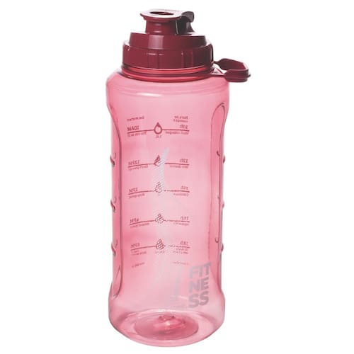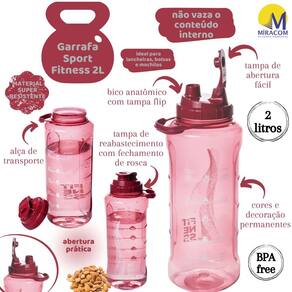 A garrafa é graduada e tem decoração permanente, estampada com tecnologia intra-imagem, que garante vida longa às suas cores e desenhos. A camada generosa de polipropileno nela investida, garante vida longa à peça. Ela é translúcida com predominância rosa e a tampa superior sobre a de rosca conta com um movimento basculante simples, que garante que na medida em que é movimentada para cima, o bico fica exposto e surge pronto para o uso. Ela tem uma capacidade generosa para 2 litros e é produzida em polipropileno de alta densidade, atóxico e livre de BPA em sua composição (BPA Free), possibilitando inclusive ser levada ao freezer e ao micro-ondas. Tanto a tampa superior quanto a de reabastecimento tem sistema anti-vazamento e fechamento de rosca da principal torna a experiência ainda mais segura, especialmente durante o transporte.