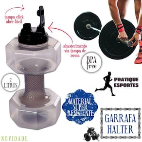 Garrafa plástica com capacidade para 2 litros, em formato de halteres de academia, com tampa abre fácil e alça de transporte. O desenho da garrafa foi desenvolvido para proporcionar um encaixe perfeito e uma pegada firme entre as extremidades mais largas do produto. A Garrafa Halter com a generosa capacidade para 2 litros é lançamento da Plasútil e foi pensado especialmente nos entusiastas do esporte, já que conta com uma aparência inspirada em artigos esportivos, além de um visual clássico, atemporal e exclusivo. A garrafa Halter é companheira ideal para quem leva a sério a hidratação do corpo e busca incansavelmente por um estilo de vida ainda mais ativo.