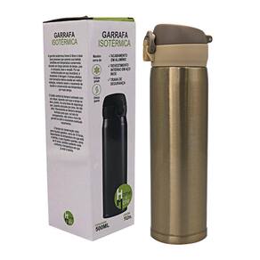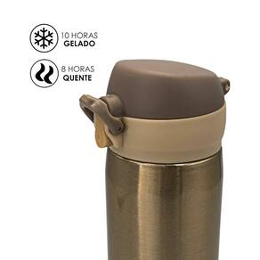 Garrafa isotérmica 500ml com tampa plástica fosca com trava de segurança - dourada Garrafa isotérmica 500ml com tampa plástica fosca com trava de segurança - dourado Produzida para manter suas bebidas favoritas na temperatura ideal e sem preocupações, a garrafa isotérmica oferece praticidade e segurança, tornando-a perfeita para acompanhar você em todas as suas atividades. Com seu design elegante e funcional, contando com uma tampa plástica com borracha interna que resulta em uma melhor vedação, evitando vazamento do líquido, com um botão central na tampa que é acionado com um clique fazendo com que a tampa se abra e com uma trava de segurança que quando colocada para cima, ela não se abre. Confeccionada em aço inoxidável, tem uma excelente durabilidade e é resistente à ferrugem, além de isolamento térmico, que mantém as bebidas quentes por até 8 horas e frias por até 10 horas, podendo desfrutar de uma bebida refrescante ou um café quentinho onde quer que esteja, pois é compacta, leve e versátil.